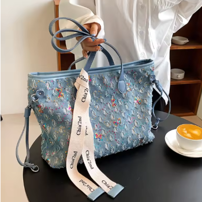 Women's Denim Tote Bag Medium Size All Seasons Embroidered Flower Classic Style Square Zipper Shoulder Tote Bag